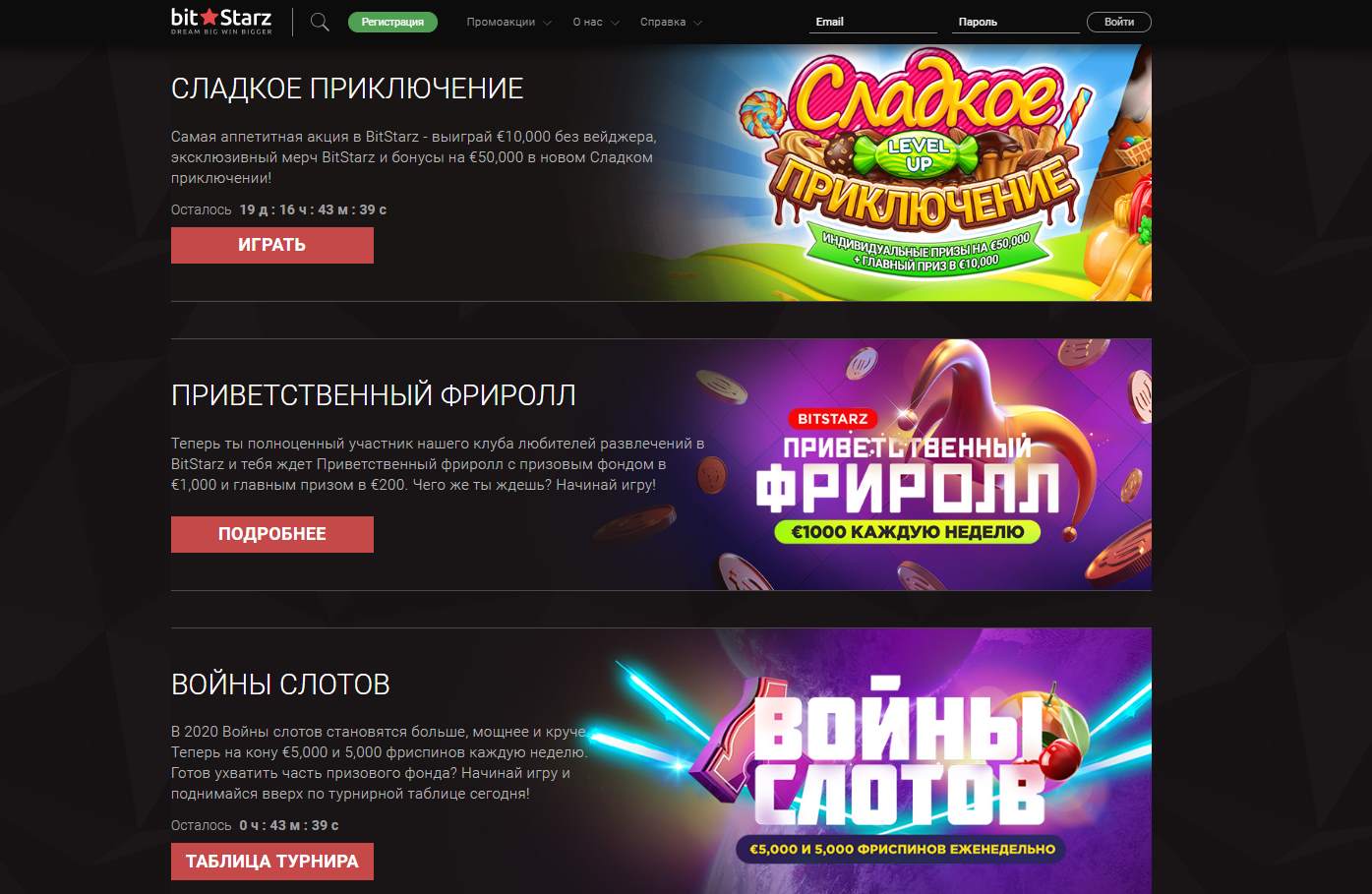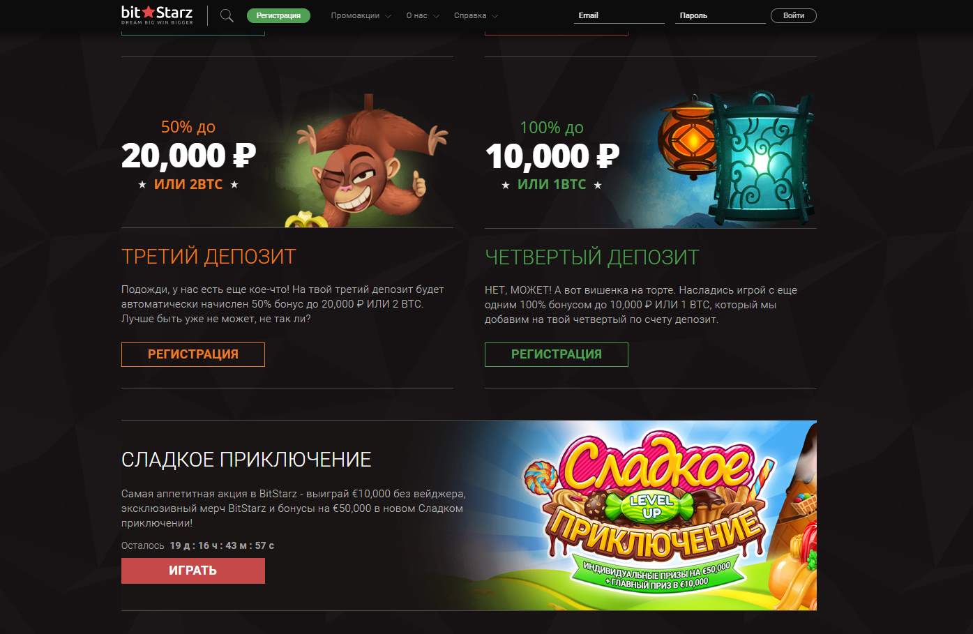 Как уже упоминалось, BitStarz имеет акции и бонусы, которые, как правило, несколько грандиозны по стоимости. Более того, их много. Чтобы начать игру, игроки могут получить приветственный бонус в четыре этапа. Это обеспечивает приличные денежные бонусы для внесения депозитов игрокам и может быть заявлено с использованием биткойнов или бумажных валют, таких как евро. На момент написания этой статьи даже существует бездепозитный бонус, который предлагает бесплатные вращения при регистрации. Кроме того, условия являются приятными и выгодными для игроков. Проверьте детали бонуса выше!