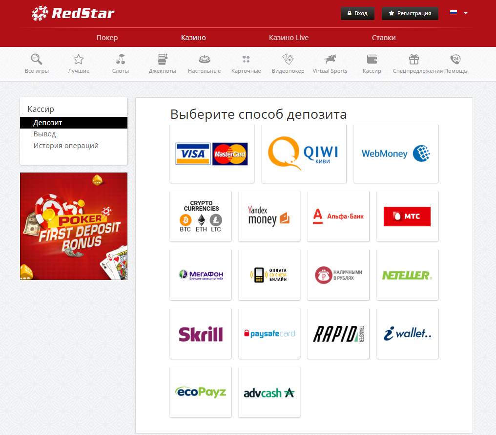 Способы депозита и вывода средств в Redstar казино