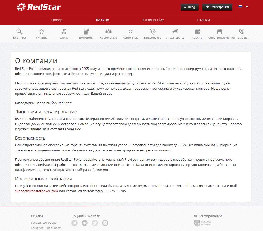 Red Star Casino – это отличное времяпрепровождение, где вы сможете насладиться множеством вариантов классических настольных и карточных игр казино, огромным разнообразием известных во всем мире слотов, а также сможете сделать ставки на события из мира спорта, кино и ТВ и сыграть турниры в любимую разновидность покера. Казино гарантирует своим клиентам полную конфиденциальность персональных данных и честность результатов предлагаемых игр. Быстрые выплаты выигрышей и приветливая служба поддержки оставят хорошее послевкусие.