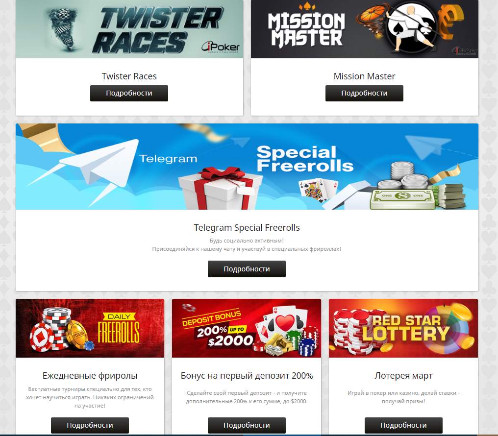 В разделе «Покер» вы найдете ежедневные турниры и фрироллы по Холдему, Омахе, а также 5-карточному Дро и Раззу. Также вы можете выбрать кэш-игру на низких, средних и высоких лимитах.