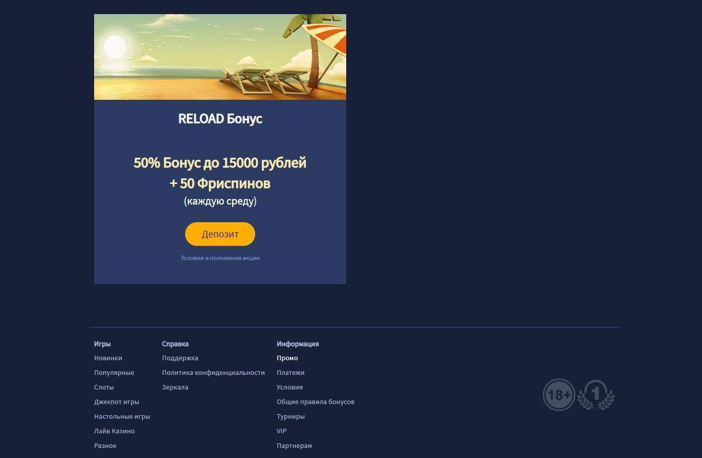 - Reload бонус по средам 50% Бонус до 15000 рублей + 50 Фриспинов