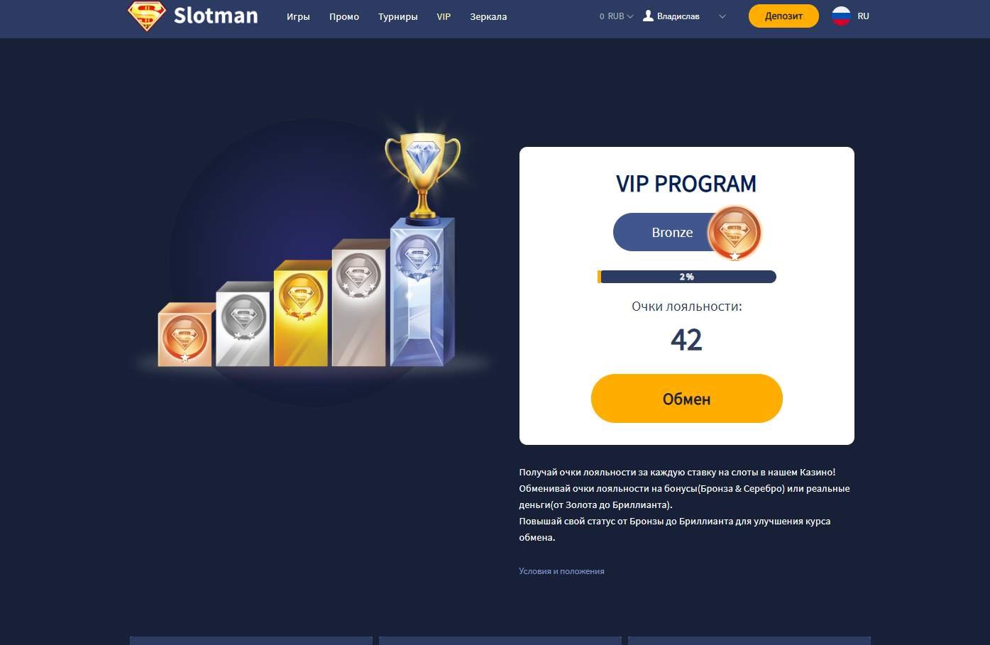 Наконец, Слотман является домом для захватывающего VIP-клуба. Эта бонусная программа лояльности позволяет вам получать карманные очки с каждой сделанной ставкой. Эти баллы можно обменять на бонусы (на бронзовом и серебряном уровнях) и конвертировать в реальные деньги, если вы достигнете Золотого и Алмазного уровней клуба лояльности.