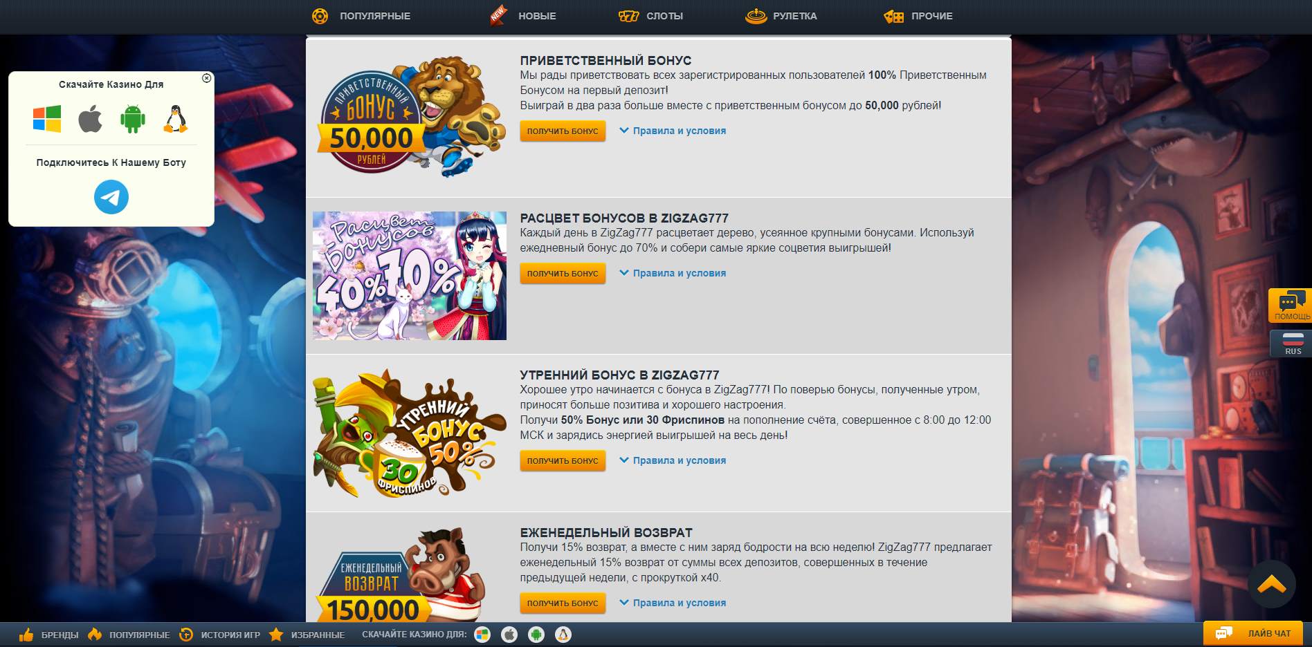 Онлайн-казино дебютировало в 2016 году, и с тех пор ZigZag777 использует свой богатый опыт и ноу-хау, чтобы предоставить именно тот тип услуг, который хотят видеть игроки. Множество игр, безопасная среда и справедливые бонусы и акции. ZigZag777 Casino имеет лицензию на Кюрасао и обслуживает игры на английском, немецком и русском языках и принимает как валюты FIAT, так и методы оплаты на основе криптовалюты.