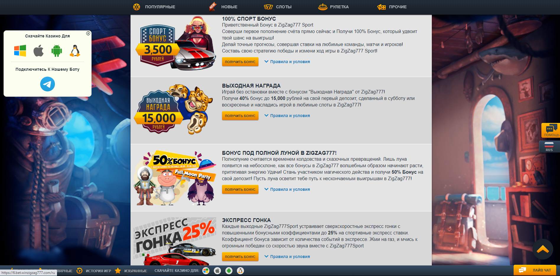 Став новым игроком на ZigZag777, вы получаете право на приветственный бонус казино. Это предложение стоит приличного денежного бонуса, и оно ваше, как только вы впервые внесете деньги на свой счет. Процесс регистрации тоже плавный и быстрый. Если вам интересно, в казино также есть специальный приветственный бонус для игроков, делающих ставки на спорт. Это не так грандиозно, как главное приветственное предложение казино.